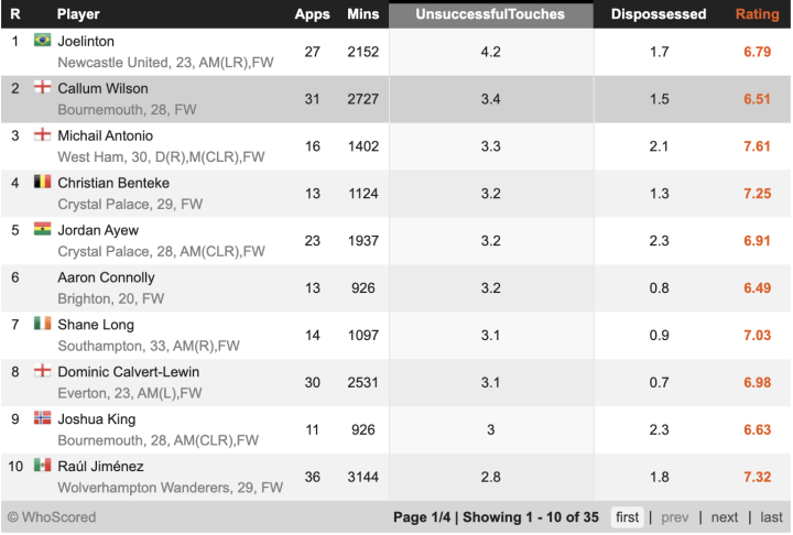 (图)乔林顿在英超首发出场超过10次的中锋中是平均丢失球权最多的,并且大幅多于第二名伯恩茅斯前锋威尔逊