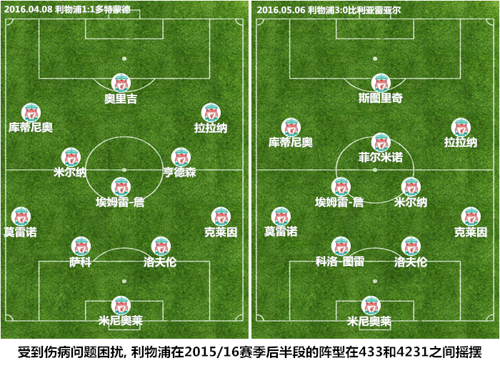 2015/16赛季,在带领红军冲击欧联杯冠军的过程中,克洛普一直使用4231阵型,而后由于本特克和奥里吉先后出现状况,菲尔米诺改打9号位,利物浦的阵型逐渐固定为433;