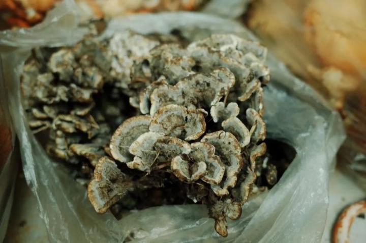 但它即使在云南这种菌子王国里,也是珍贵、少见的野生菌。品质好的干巴菌,市场价格高达四位数。