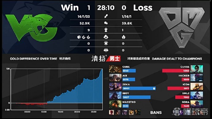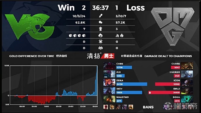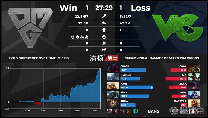 在绝对的伤害差距之下,OMG本来就缺乏主动性的阵容根本找不到任何翻盘的希望,被VG不断的拉扯和施压,27分钟双方最后在中路爆发了一波团战,VG全面压制将OMG团灭后也毫不拖延,从下路高地直接一波平推结束了比赛。恭喜VG取得1:0领先。