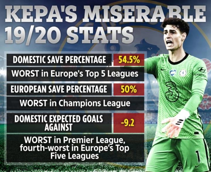 切尔西门将凯帕近期的表现受到了球迷的大肆批评,喜欢搞事的《太阳报》还专门列出了一份数据,展示凯帕本赛季的糟糕状态。
