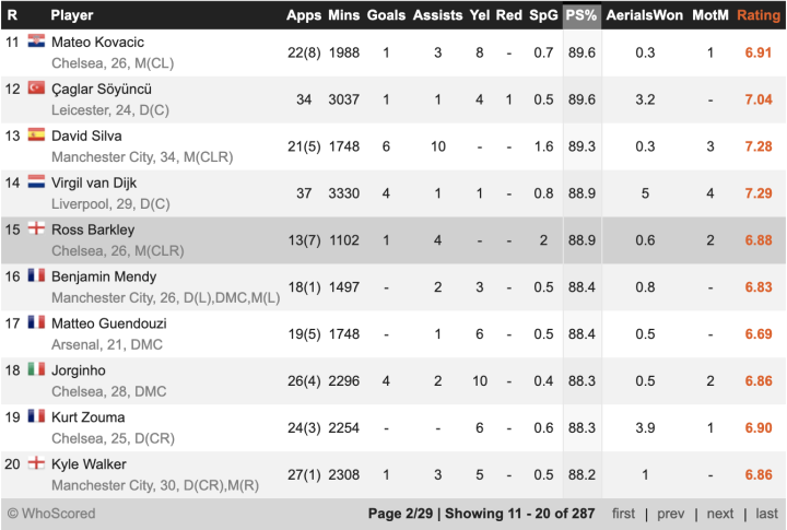 (图)科瓦契奇的传球成功率排在287名出场超过平均值的球员中的第11位,在队内仅次于克里斯滕森