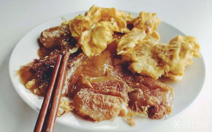 用米浆制成的粿块,煎炒后打上鸡蛋撒上葱花,外香里嫩,不信你不嘴馋。