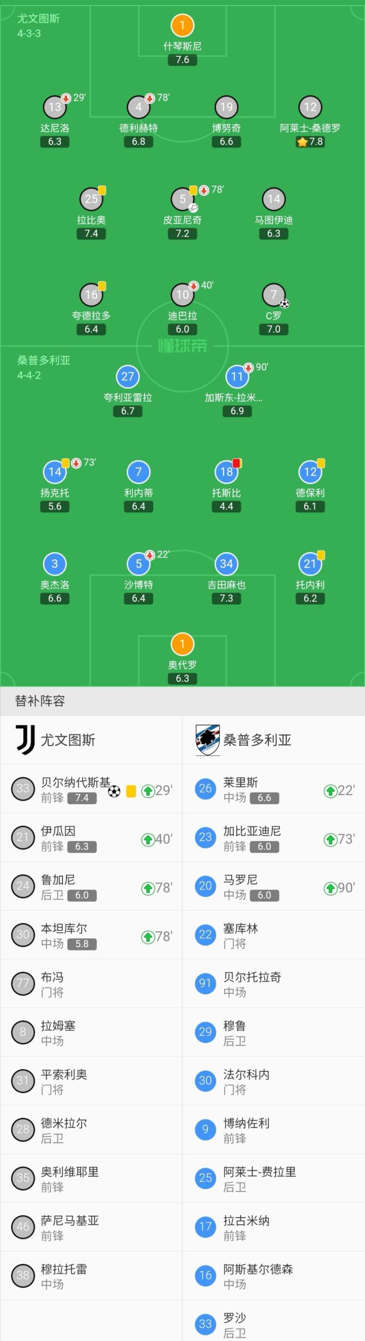 尤文图斯首发:1-什琴斯尼、13-达尼洛(29`33-贝尔纳代斯基)、4-德利赫特(78`24-鲁加尼)、19-博努奇、12-阿莱士-桑德罗、5-皮亚尼奇(78`30-本坦库尔)、25-拉比奥、14-马图伊迪、16-夸德拉多、10-迪巴拉(39`21-伊瓜因)、7-C罗