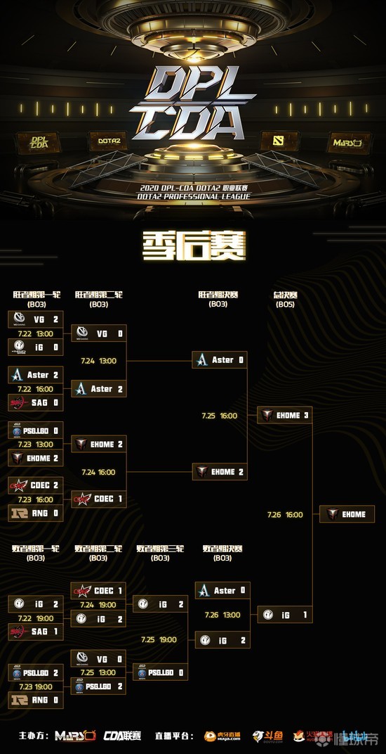 由Mars耀宇传媒与CDA联盟联合主办的DPL-CDA中国Dota2职业联赛S2赛季于7月26日晚圆满结束。历经外卡赛、预选赛、升降级赛以及常规赛和季后赛五个阶段的精彩对阵,最终EHOME在季后赛的争夺中一路连克强敌,决赛中以3-1的比分战胜IG战队夺得DPL-CDA S2冠军,成功卫冕。IG和Aster分获亚军和季军。