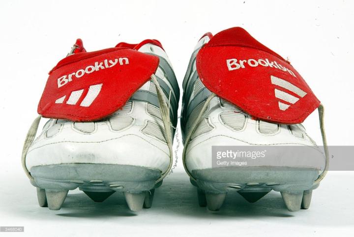 此后,小贝就成为了adidas重点扶持对象,不多久他就穿上带有beck’s刺绣的猎鹰3足球鞋,并且参加了1997年的猎鹰3的克隆人广告拍摄,列入adidas一线大牌行列,所以1998年起小贝的猎鹰4代天足上后跟有自己的名字刺绣,鞋舌上有儿子布鲁克林的名字刺绣。小贝当时穿鞋有个个人喜好,就是鞋带帮的很低,至少两排鞋带孔是没有穿鞋带的,所以鞋舌特别长,他的猎鹰足球鞋鞋舌上总是有松紧带用来固定鞋舌,而鞋舌的材质也比一般的量产要柔软很多,背面是绒布材质。