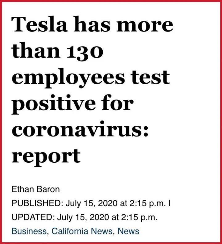 结果,不出意料地在7月15号,该特斯拉工厂就有超过130名工人被检测出COVID-19阳性,人类之光的科技工厂,爆发了本可以避免的疫情。