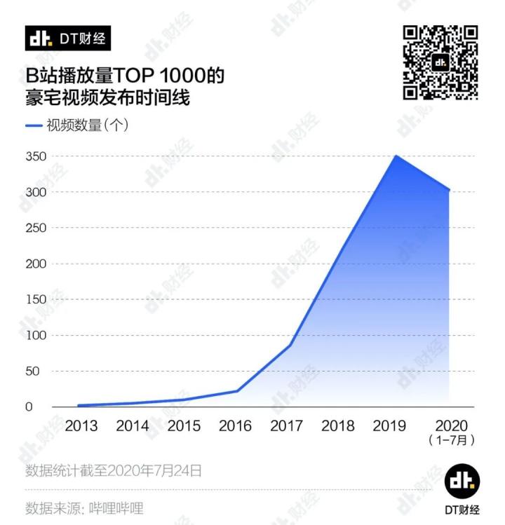 我们采集了B站播放量TOP 1000的豪宅视频,发现:至少从2013年开始,就有UP主开始在B站上传豪宅视频,而且近几年豪宅视频的热度在不断上升。其中有超过35%的热门豪宅视频都诞生于2019年。2020年虽然才过去一半,但也有300多条热门豪宅视频出现,几乎与2019年全年持平,几位头部UP主功不可没。