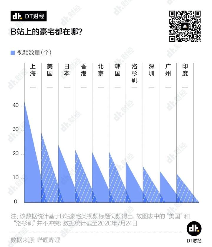首先是豪宅所在地都相当富裕。我们发现,从视频拍摄地来看,B站上的豪宅大多在上海、香港、北京、洛杉矶、深圳、广州这些国内外的知名城市,以及美国、日本、韩国等发达国家。发达地区的富人多,豪宅数量自然水涨船高。