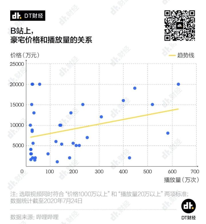 我们将B站上38条同时符合“房屋总价千万以上”“播放量20万以上”两项标准的豪宅视频在坐标系上打点,发现房屋总价和播放量多少有点正相关——房子越贵越新奇,看的人可能就越多。
