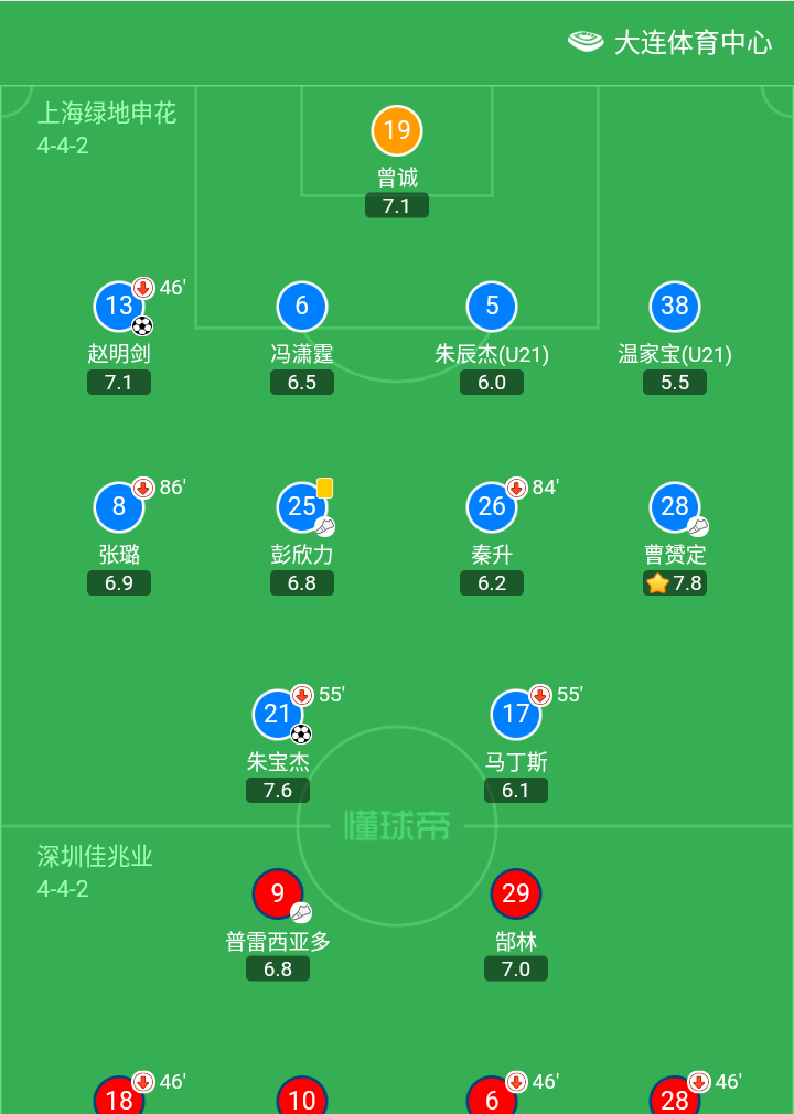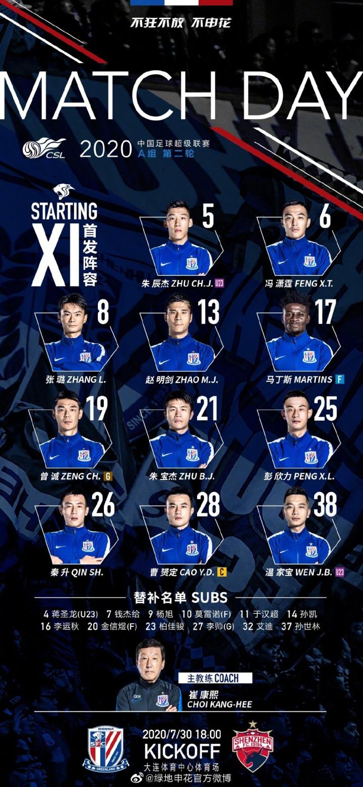 申花首发:19-曾诚、38-温家宝(U23)、5-朱辰杰(U23)、6-冯潇霆、13-赵明剑、28-曹赟定、26-秦升、25-彭欣力、8-张璐、17-马丁斯、21-朱宝杰