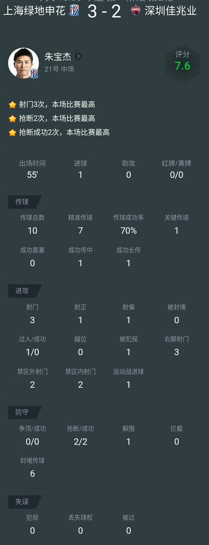 朱宝杰上赛季面对深圳佳兆业踢出顶级表现,不仅攻入一球帮助北京人和1:1战平对手,他的助攻还险些帮助球队拿到保级的关键3分。本场朱宝杰首发出现在熟悉的9号半位置,在右路和张璐搭档,通过加强中场的拦截和回做接应将中前场打通,把前国脚、自己的足校队友姜志鹏压制在半场毫无作为。比赛第9分钟,赵明剑接彭欣力回做,连续晃过三名防守队员后突入禁区大力抽射破门,申花一球领先。第45分钟,朱宝杰禁区外围尝试一脚远射没有命中目标。易边再战,第48分钟,曹赟定右路传中,马丁斯禁区内干扰深圳后卫,朱宝杰禁区内连停带过,抢在对方门将出击前捅射得手,申花扩大领先优势,朱宝杰用进球回报了崔康熙的信任,同时也攻入了广西球员本赛季中超的第一球。第55分钟,朱宝杰被莫雷诺换下,完成了自己的申花首秀。最终上海绿地申花3:2深圳佳兆业,取得新赛季首胜。赵明剑世界波开胡,曾诚率现神扑,冯潇霆定海神针,秦升中场铁闸,曹赟定指挥中枢,彭欣力串联中场,朱宝杰在更强大队友们的助攻下,弥补了上赛季未能拿下对手的遗憾,也兑现了自己为上海而战的诺言。