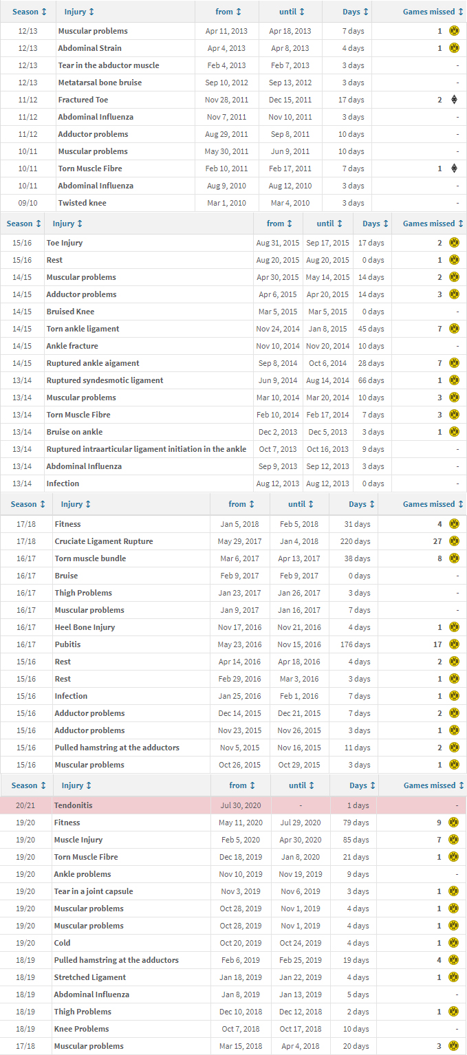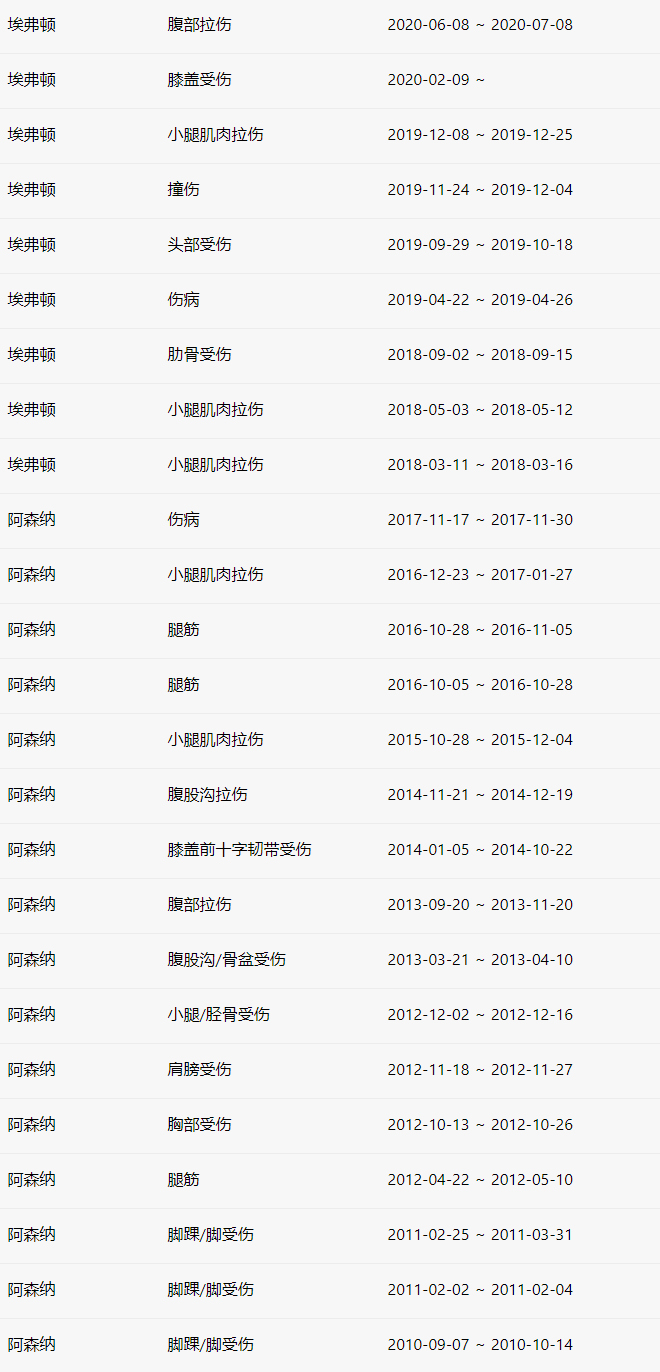 谁也没想到,单赛季21球的表现居然成为了沃尔科特职业生涯的最后高光,这位才华横溢的英格兰边锋开始深受伤病问题影响,职业生涯迅速走上了下滑路。如上面这张图片所展示的一样,其实沃尔科特的“玻璃人属性”早在2010~2011赛季就已经开始了,不过当时的他尚且还能够依靠着后天的努力克服伤病。但随着伤病的堆积,加之年龄的增长,勤奋的小老虎也不得不低下高昂的头颅,成为又一名被伤病影响的天才球员。