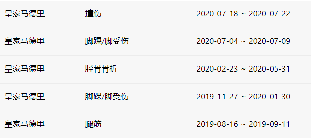 新赛季开赛不久后,阿扎尔就因为腿筋受伤缺席了球队一个月的比赛;11月底,这位比利时国家的队长又因为脚踝受伤缺战两个月;到了今年2月份,阿扎尔又因为胫骨骨折缺战三个多月的比赛;6月份回归后,阿扎虽然没有再出现较为严重的伤病问题,但依旧是小伤不断。