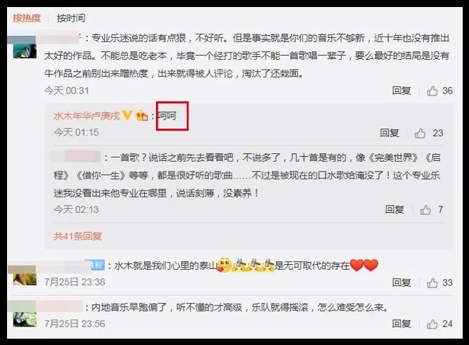 有人在凌晨12点31分的时候在卢庚戌微博下面批判了水木年华一番,卢庚戌可能是在半夜纠结了54分钟,最后在凌晨1点15分,回复了一个“呵呵”。