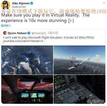 攒钱吧,《微软飞行模拟》的VR体验比PC版要棒10倍buddj @懂球帝2020-08-01 21:59《微软飞行模拟》可以说是Xbox Game Studio在2020年最值得期待的游戏之一,这款作品将于2020年8月18日发布。8月1日,微软MR头显Hololens 团队负责人Alex Kipman在社交媒体上表示,该作的VR体验比在PC版上要棒十倍。据悉该作会在今年稍晚支持虚拟实境头戴式装置(VR),首先将支持的是预定今年秋季推出的 HP Reverb G2。展开更多