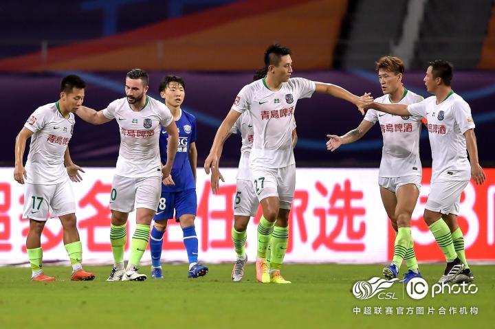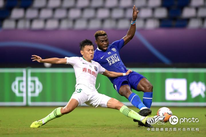 第34分钟,对方外援奥斯卡头球破门,场上比分0-1,青岛黄海青港队落后。