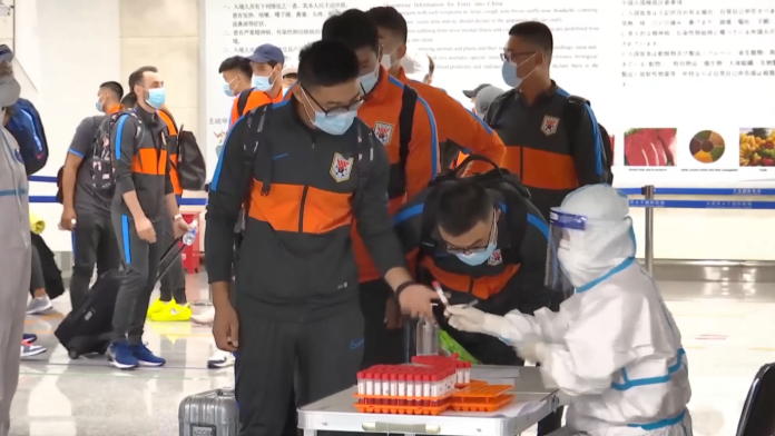 跟在富力队后面的是山东鲁能,他们乘坐的包机提前抵达周水子机场。教练李霄鹏、队长蒿俊闵陆续走出为中超球队专门设置的23至26号廊桥,步行约100米左右就来到了核酸检测点,这块区域是专门为7支中超球队设置的绿色通道。
