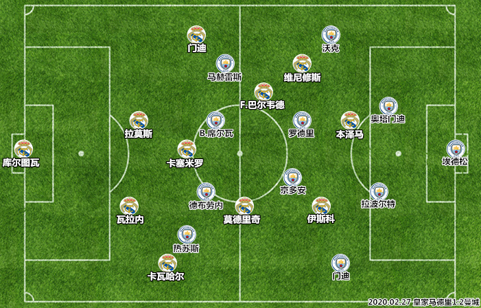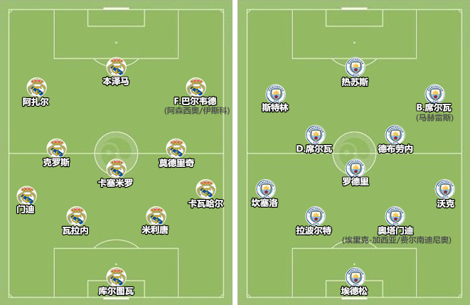 瓜迪奥拉在首回合较量中出人意料地选择保守,一方面是慑于做客伯纳乌的难度,一方面是因为斯特林受伤。次回合较量,斯特林回到首发阵容,但最可靠的终结者阿圭罗无法登场,主力左后卫门迪停赛,瓜迪奥拉依然能够找到保守的理由。