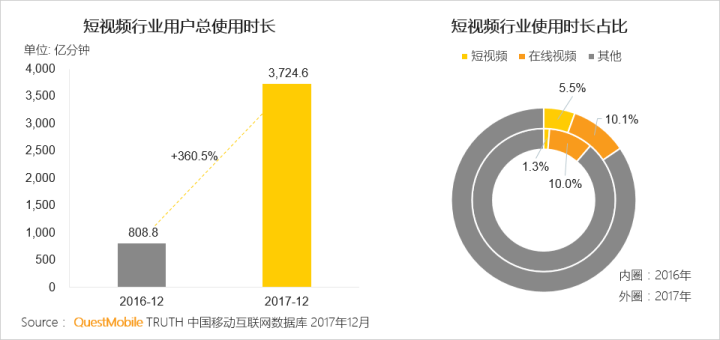 扎克伯格畏缩以后,字节跳动的张一鸣和快手的宿华加入了竞购 Musical.ly 的阵营。当时中国移动互联网生态正在从文字、图片往短视频以及再后来的直播转型。根据 QuestMobile 的数据,短视频行业的用户规模也正从 2 亿人快速向 4 亿人冲刺,国内网民会花 5.5% 的上网时间在短视频里面,而这一比例在 2016 年刚刚达到 1.3%。