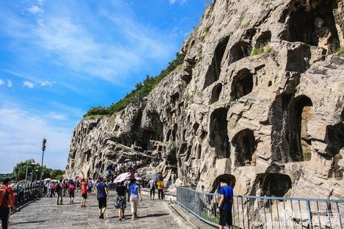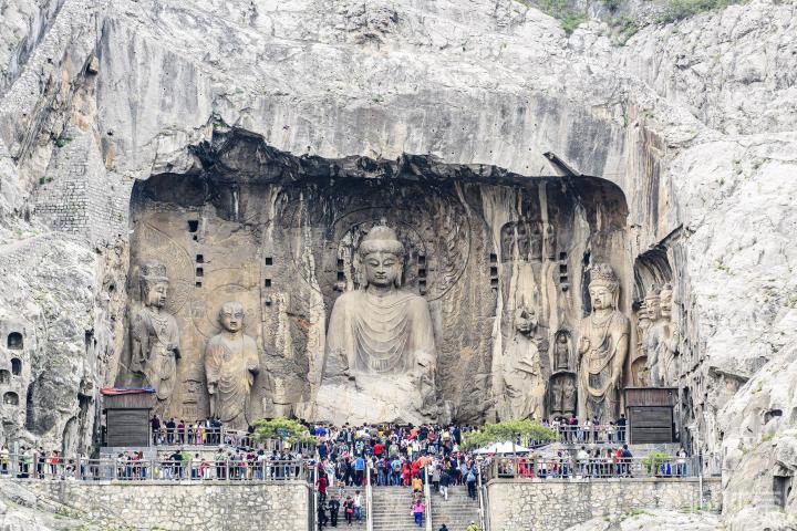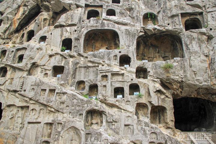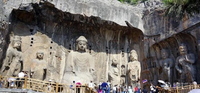 龙门由大禹治水中所开凿,鱼跃龙门的传说亦发生于此。其石窟则始凿于北魏孝文帝年间,盛于唐,终于清末。历经10多个朝代陆续营造长达1400余年,是世界上营造时间最长的石窟。建造时采用了大量彩绘,今多已褪色。 密布于伊水东西两山的峭壁上,南北长达1公里,现存洞窟像龛2345个,造像11万余尊,与莫高窟、云冈石窟并称中国三大石窟,后加麦积山石窟称四大石窟。