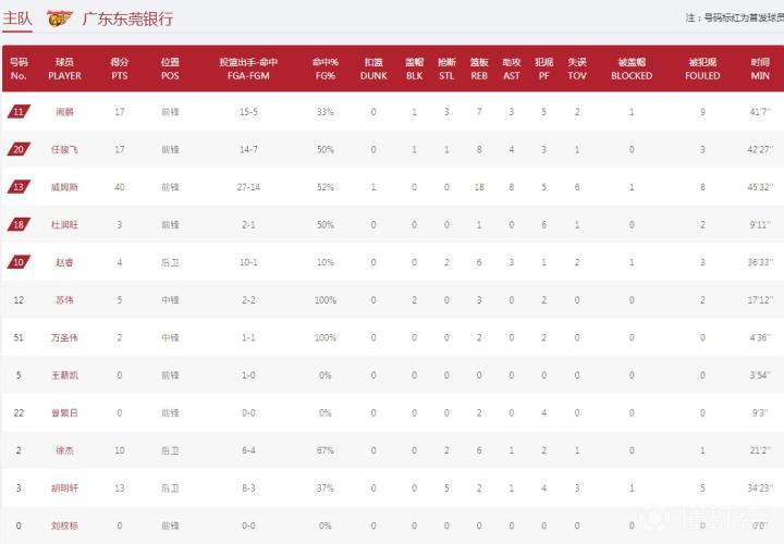 广东东莞银行:20-任骏飞、18-杜润旺、13-威姆斯、11-周鹏、10-赵睿
