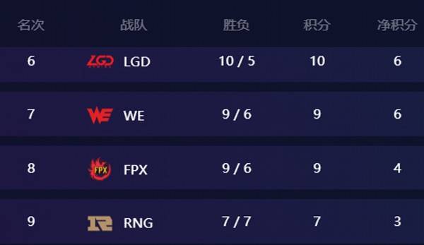 但凡这两场比赛RNG输掉了一场,则直接淘汰出局,FPX和WE就可以不管胜负直接携手晋级了,毕竟FPX和WE是9胜,RNG只有八胜利。