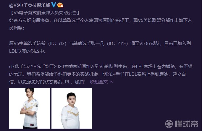 clx选手与ZYF选手均于2020春季赛期间加入到V5的队列中来,在LPL赛场上奋力搏杀,有不错的表现。我们希望能给予他们更多的实战机会,期盼选手们在LDL赛场上得到磨练,建立自信,以更强更好的状态再战LPL,加油!