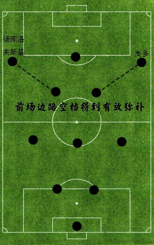 正是基于这样的背景环境,尽管圣诞树阵型在当时取得了非常不错的成绩,但依旧鲜有球队敢于尝试。为什么AC米兰能够熟练使用4321阵型,并且保证边路防守的稳固度呢?原因很简单,无论是左边后卫位置上的扬库洛夫斯基又或者是右边后卫位置上的卡福、奥多都具有非常鲜明的前插属性,他们在比赛过程中上压到边锋的次数非常之多。如上图所示,当两名边后卫到达边锋位置时,AC米兰的首发4321阵型就此变更为前场横向覆盖面积更大的2323阵型。这样一来,即便米兰进攻出现失误导致皮球被断,前场堆积的众多球员也能够第一时间发动就地反抢,从而寻觅到发动二次进攻的机会。