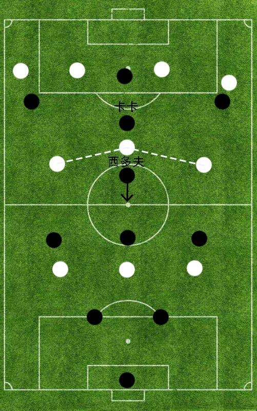 通过我们上面的描述,大家已经可以感受到卡卡在米兰进攻过程中对于中前场串联的有效帮助。通常意义上来讲,尽管卡卡和西多夫在战术板上处于平行位置,但前者在进攻过程中的压上幅度明显要比后者多。因此,在某些时候,我们可以将米兰在进攻过程中的站位理解为23113。为了保证球权过渡的安全性,脚法精湛且身体对抗能力较为出众的西多夫往往会回撤到三名后腰身前,提供一个有效而稳定的接球点。