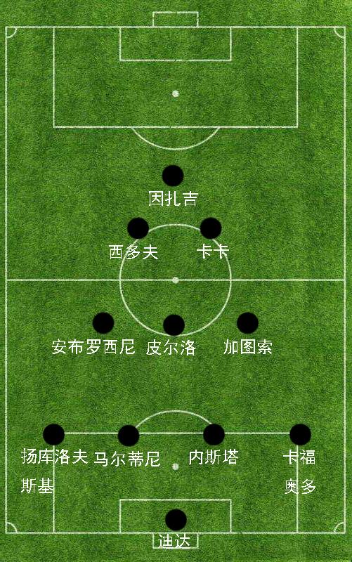 我们来看一看AC米兰在2006~2007赛季时的主力阵容。在前锋线区域,身体单薄但进球能力极佳的因扎吉出任球队的单前锋;在中场区域,荷兰球星西多夫搭档巴西国脚卡卡成为球队的两名前腰,在他们两人身后的三名后腰从左至右分别是安布罗西尼、皮尔洛以及加图索;在后卫线方面,马尔蒂尼搭档内斯塔出任球队的双中卫,左右两边的两名边后卫则分别是扬库洛夫斯基以及卡福(也可以是奥多);在门将位置上,来自巴西的迪达发挥非常稳定,即便他身前稳若泰山的4人防守线被对手突破,这位巴西国门也能够用精彩的门线扑救力保城门不失。