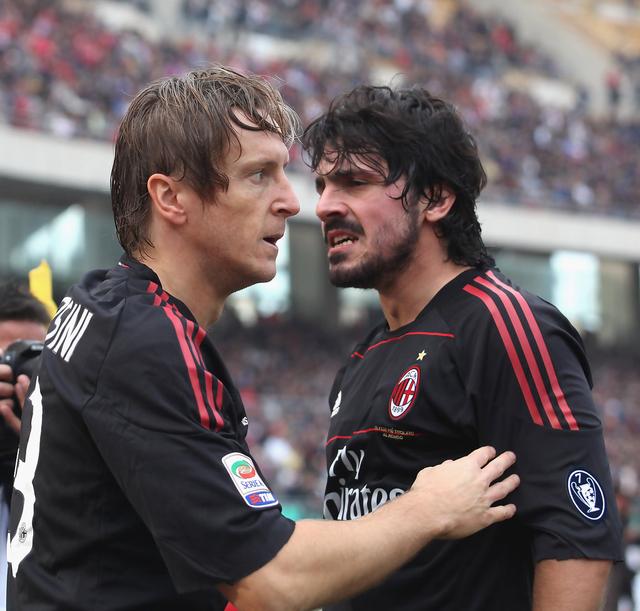 说到反击,我们就一定要提到米兰阵中的几位关键人物--中后卫马尔蒂尼和内斯塔、后腰加图索(未提到的球员不代表在防守过程中没有贡献,只是这三人做出的贡献最为突出)。马尔蒂尼和内斯塔不必多说,他们代表着意大利足球的一个时代。从技术特点上来看,我们可以给这两位球员一个准确的评价--“意识出众”。的确,出色的比赛意识几乎成为了那个时代顶级意大利后卫的标配特点。无论是金球先生卡纳瓦罗,又或是带领米兰走向欧洲之巅的马尔蒂尼和内斯塔,他们在比赛过程中并不以蛮横的拼抢作风闻名,而是能够展现出一种“极为优雅”的防守思路。