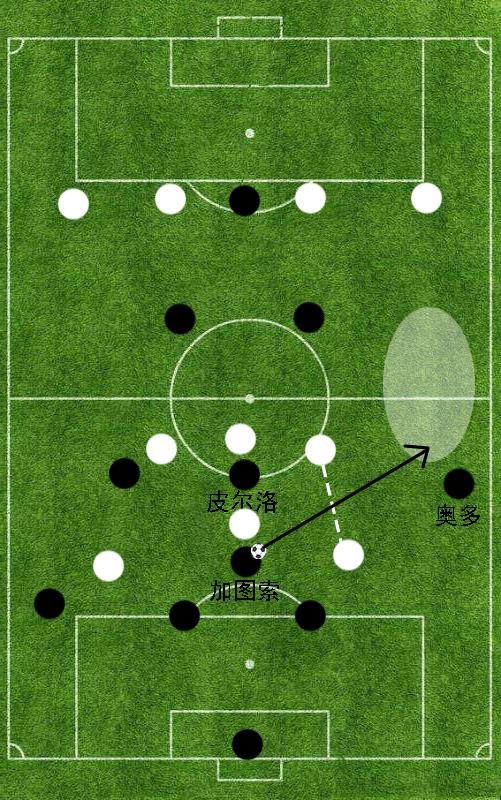 为了使球队的进攻更加流畅化,加图索在双中卫拿到皮球后往往会选择离开后腰位置,回撤到后卫线进行接球。由于加图索与皮尔洛的黄金搭档早已名扬全世界,当他拿到皮球后,对方在中场设置的防守球员必然会第一时间靠近皮尔洛,以图能够直接切断这两位意大利国脚之间的连线。对手这样的战术布局似乎取得了心仪的效果,但恰恰中了安切洛蒂的调虎离山之计。一旦皮尔洛在皮球推进过程中受到重重包围,加图索就会放弃与这位意大利球星进行连线,转而将皮球输送到对方防守力量较为薄弱的边路(一般是交给右边后卫),AC米兰就此可以在边路轻松发动快速进攻。