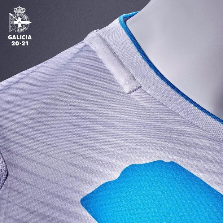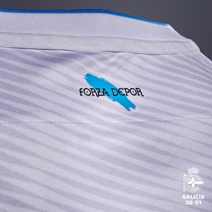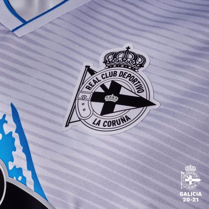球衣胸前的俱乐部徽章采用简约的单色设计。衣领与袖口上分别加入天蓝色与黑色条纹装饰。背后衣领下方加入带有“FORZA DEPOR”(加油拉科)字样与手绘风格天蓝色绶带图案的徽章,庆祝一年一度的加利西亚日,并展现拉科鲁尼亚作为加利西亚自治区代表的身份与地位。