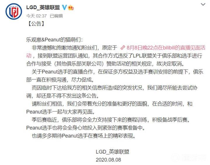 8月8日,LGD英雄联盟发文,因合作方式违反了LPL联盟关于俱乐部和选手进行合作与接受(其他俱乐部关联公司)赞助活动的相关规定,LGD打野小花生Peanut直播活动取消。