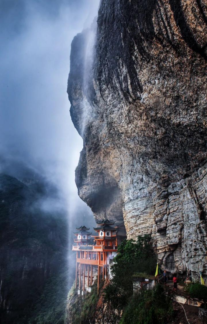 江西以南,福建灵通山,是1亿多年前由陆相沉积、火山多次喷发形成的,素有“小黄山“之美誉。此山有两绝,一是321米的“第一天然大佛头像”,另一绝便是“珠帘化雨千米飞瀑”的景观。这条瀑布,因火山爆发后形成的蜂窝状岩石收集雨水而形成,从悬空的灵通寺前奔流而下,与悬空的寺庙建筑交相辉映,令人啧啧称奇。