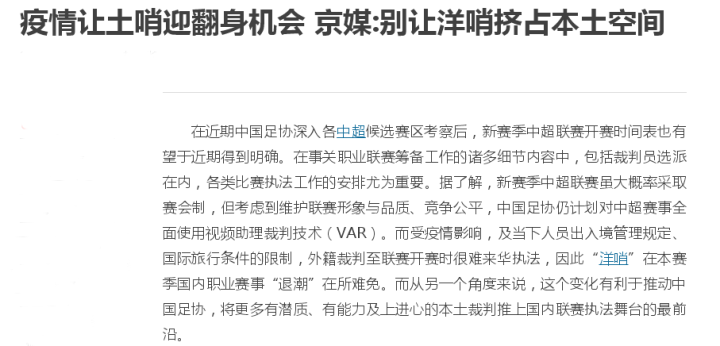 由于疫情影响,克拉滕伯格、马日奇等外籍主裁也因为疫情无法来华执法比赛,所以本赛季中超以及各级联赛的裁判只能全部由“土哨”担纲。本来这是一件令人惋惜的事,可在联赛开始前,某知名媒体发文称,这是土哨的翻身机会,不能让洋哨挤占本土空间。