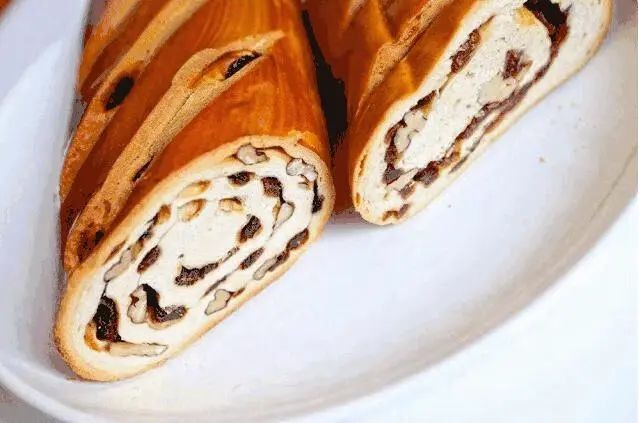 黑麦粉换成精制小面粉,抛弃水而用牛奶和面,糖、鸡蛋、黄油也不能缺,里面还包裹上许多的蜂蜜、葡萄干和果仁等等。