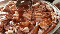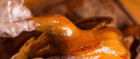当鹅身变成金黄色,汁料完全流淌出来被鹅身吸收,并凝结成粘稠的汁料后,碌鹅就大功告成了。