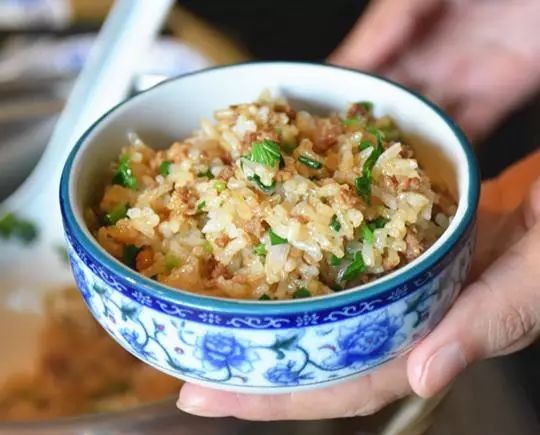 热锅下油炒香料,加入肉料爆炒后与米饭炒匀,最后放入瓦煲焗至微焦。
