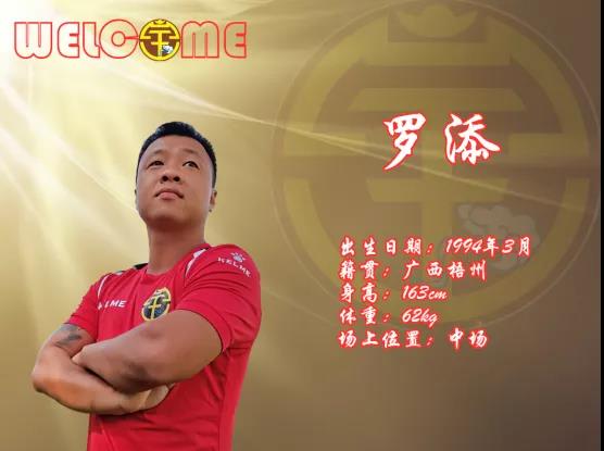 罗添,1994年出生于广西梧州,身高163cm ,体重62kg,场上司职前卫。出道于东莞南城,原中甲广东华南虎队球员,典型的南派技术球员,善于中场穿插接应跑位灵活,视野开阔。