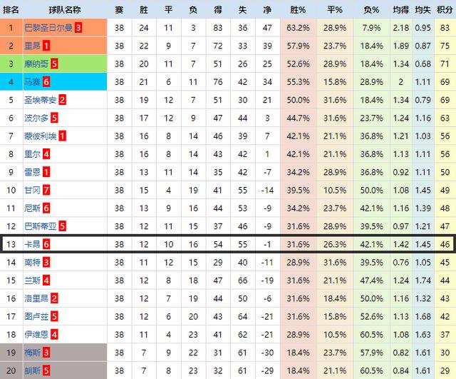 2014~2015赛季法甲积分榜
