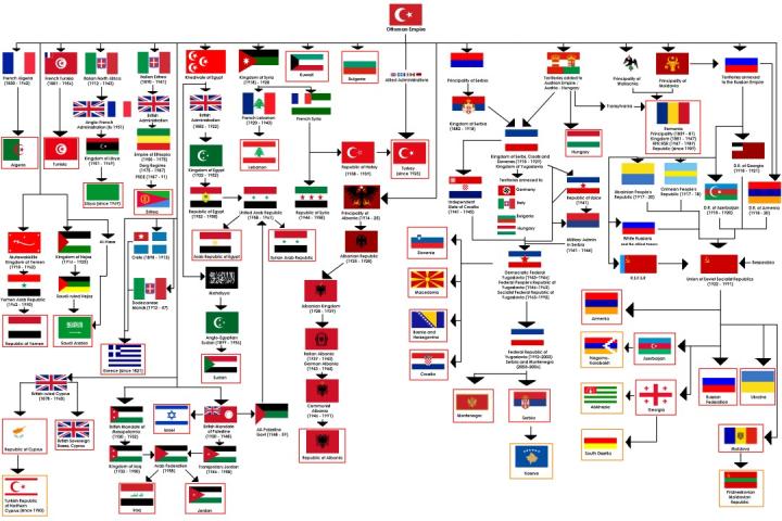 1924年3月3日,奥斯曼末代哈里发被正式废除并流放,宣告了奥斯曼帝国的解体。原帝国则在英法等国的干预下,被划分为一众民族国家,包括今天的土耳其、伊拉克、巴勒斯坦、叙利亚、约旦和其他波斯湾沿岸阿拉伯国家,并由法国,英国等委任统治。