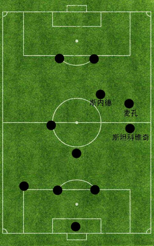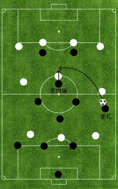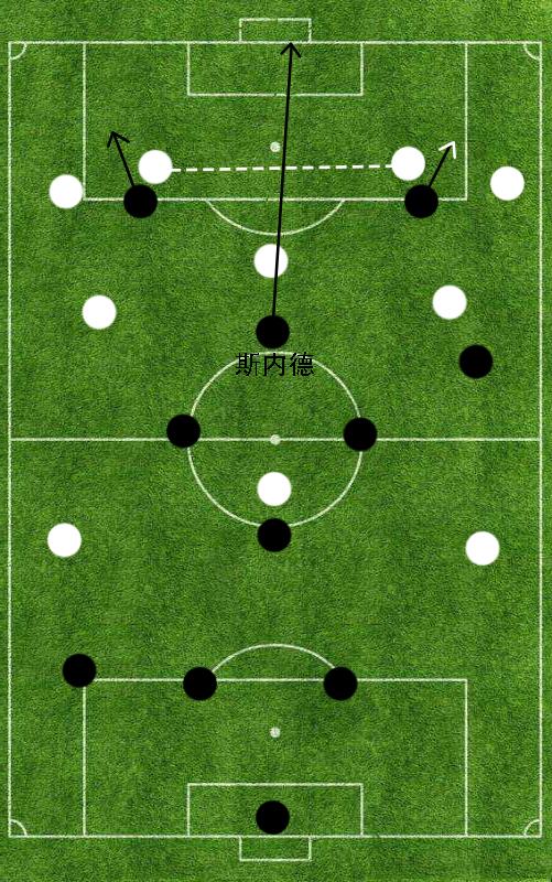 有了坎比亚索以及莫塔两位球员在后防线的接应,5号斯坦科维奇以及10号斯内德就可以将更多的注意力投入到进攻当中。需要强调的是,斯坦科维奇和斯内德虽然都是球队中场进攻的关键人物,但他们在进攻过程中承担的职责却截然不同。考虑到5号斯坦科维奇在边路拥有极强的突击以及小范围配合意识,穆里尼奥会让他靠近右路搭档高速插上的右边后卫13号麦孔,形成有效的右边路进攻体系。而10号斯内德则会利用自身出众的脚法以及卓越的场上大局观在中路起到中场枢纽的作用。