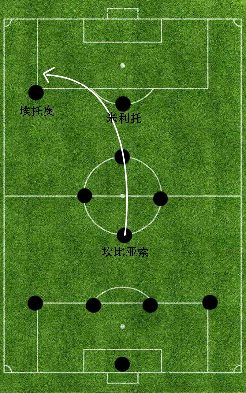 通过我们对于国际米兰当赛季反击表现的详细研究,我们发现坎比亚索更加习惯于使用长传球和9号埃托奥形成直接连线。当坎比亚索在后场拿到皮球后,原先处于对方双中卫之间的9号埃托奥会迅速撤出禁区,从而游弋到左边路成为一名左边锋。在这样的背景环境之下,坎比亚索会利用自己细腻的长传球能力迅速和非洲猎豹形成连线。这样一来,皮球就可以在极短的时间内由后场输送到对方防守兵力较为薄弱的边路,穆里尼奥对于反击的速度要求就此达成。