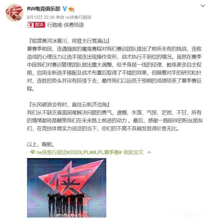 8月12日,RW官博发文对2020LPL夏季赛做了赛季总结:行路难·侠勇结语。