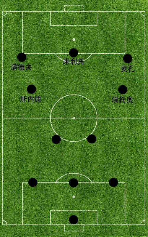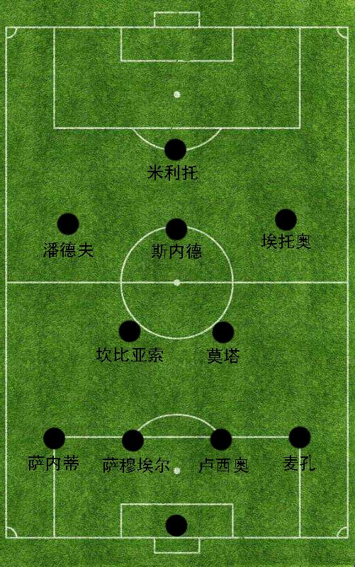 纵观当时的世界足坛,国际米兰的这一套首发阵容几乎已经算得上是“处处顶尖”:前锋线上的米利托虽然不具备非常强大的支点作用,但胜在速度极快、跑位鬼魅,加之勤勤恳恳的拼抢态度,可以说完美符合穆里尼奥对于前锋的战术要求。中前卫位置上的斯内德是当时世界上同位置中实力最为出众的球员,他的组织调度以及外围远射几乎都无懈可击。与此同时,处于左右两边的潘德夫、埃托奥、萨内蒂、麦孔都是一等一的边路进攻好手,他们在边路的反复冲击同样可以为蓝黑军团苦苦追求的边路快速进攻带来有效的帮助。