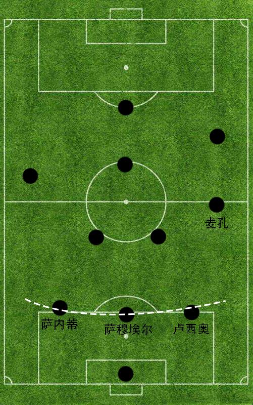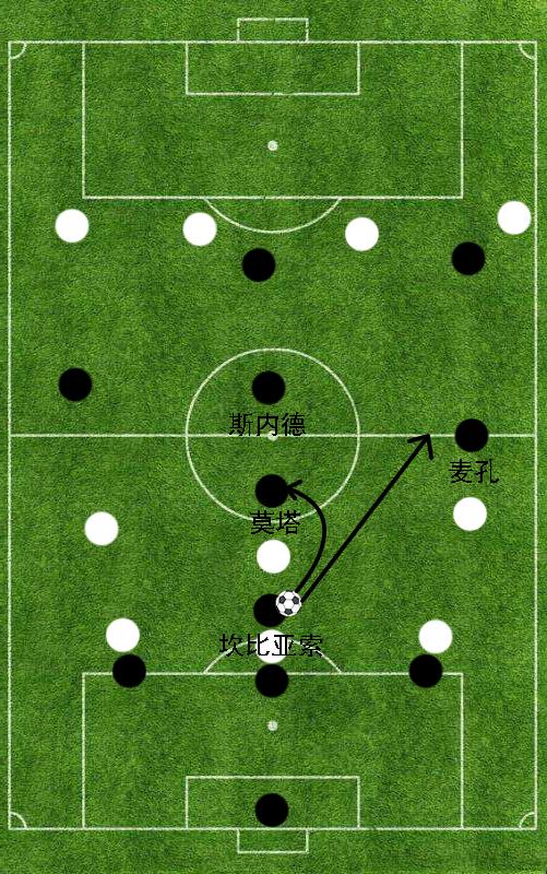 当双中卫萨穆埃尔以及卢西奥拿球后,19号坎比亚索会第一时间回撤到后卫线身前,进行主动要球。可以想象,坎比亚索的主动回撤必然会吸引对手中场球员进行跟随性的补防移动,这样一来,国际米兰另外一名后腰莫塔便有了更大的接球空间。一旦坎比亚索能够抢在对方防守球员到位之前将皮球输送到身位更加靠前的莫塔等人脚下,国家米兰进攻众将就将获得一片进攻开阔地,无论和斯内德进行中路渗透或是和麦孔打出边中结合都显得如鱼得水。