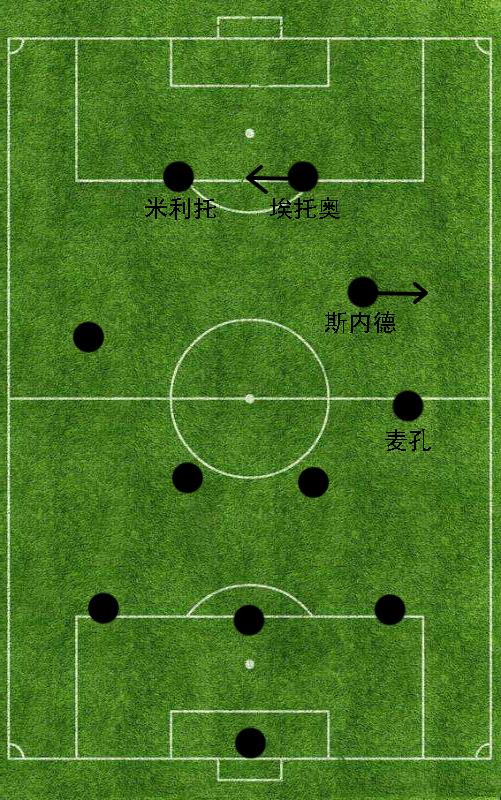 我们再来介绍一下国际米兰的主要中路进攻战术。相较于边路进攻,国际米兰的中路进攻更多依赖于斯内德与埃托奥、米利托的配合(埃托奥在进攻中不会尝试在呆在右路,待到皮球进入对手防守三区后,这位喀麦隆球星就会内收到中路,与米利托组成双前锋)。我们需要强调的是,国际米兰的进攻终结点虽然来自于中路,但发起点却来自于两名边后卫。原因非常简单,莫塔、坎比亚索两名后腰在中路必然会牵扯对方防线整体内收,左右两边的萨内蒂以及麦孔便能够侧面获得更大的拿球空间。