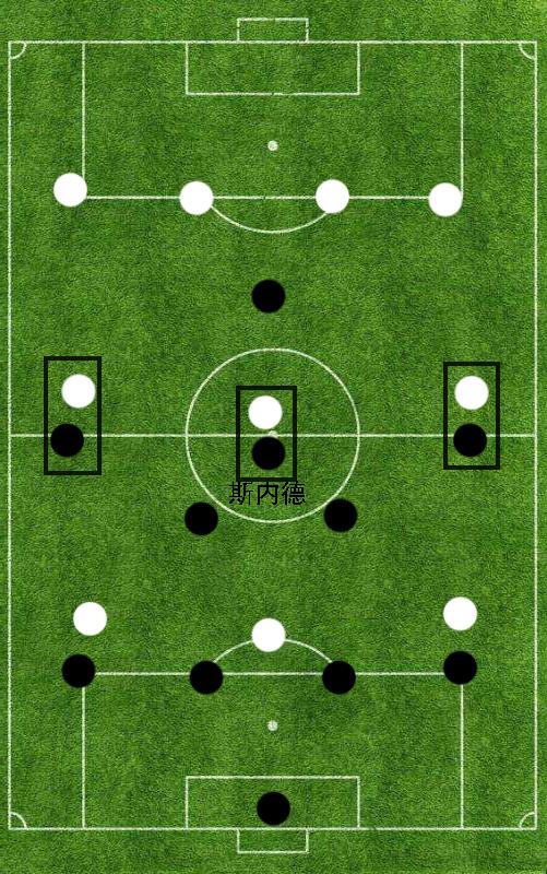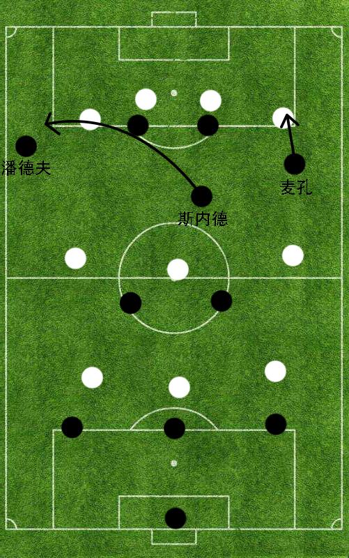 斯内德虽然在首发阵容中出现在中路,但他并不是一位固守于中路的常规组织型中场。灵巧的脚下盘带技术、卓越的场上局势观察能力······出众的个人能力让他在比赛过程中可以胜任边锋职责。当然了,麦孔在右路的后套传中只是国际米兰边路进攻的一个方式,潘德夫所在的左边路同样可以在蓝黑军团的边路进攻中发挥重要的作用。